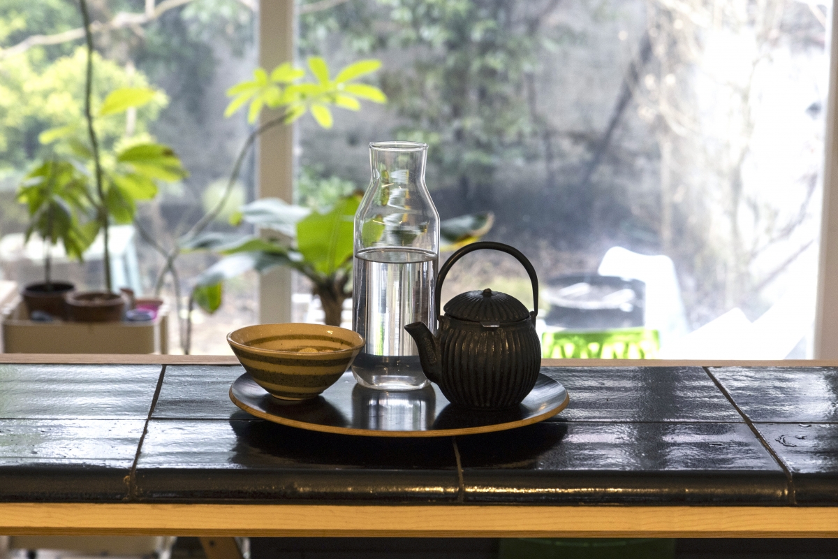 De nombreux espaces de rangement ont été créés, avec des meubles hauts et des étagères spécialement conçus pour mettre en valeur le travail de céramiste de la cliente. L’usage de matériaux de récupération est central : les carreaux muraux en granito de chez Rotor ont été réutilisés pour le sol et le plan de travail, des éléments Cubex et différents carreaux céramiques anciens ont été intégrés, et luminaires et évier proviennent également de réemploi chez Rotor.