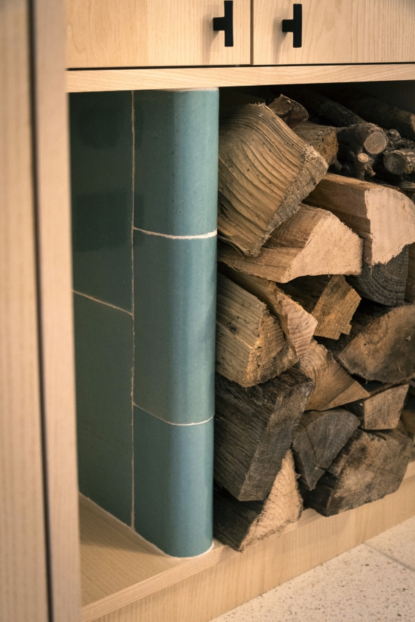 Une nouvelle cuisine a été conçue dans cet espace de circulation afin de mieux organiser la salle à manger adjacente. La cuisine devient ainsi à la fois un lieu de passage et un espace de vie, intégrant un feu ouvert, une table haute avec vue sur la salle à manger et le jardin, des rangements abondants et un coin lecture.