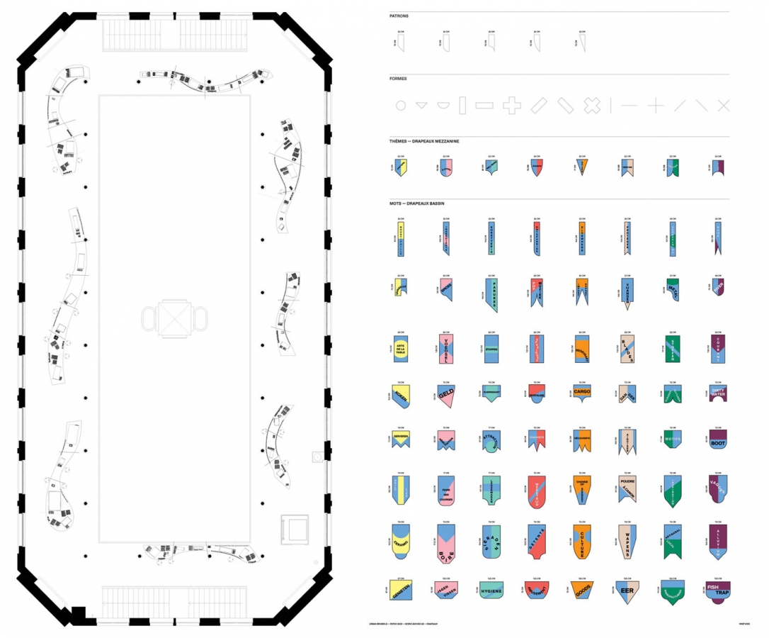 Une septantaine de drapeaux-blasons déclinent les mots-clés en écho aux thématiques de l’exposition.