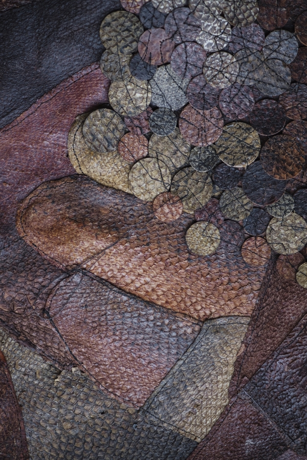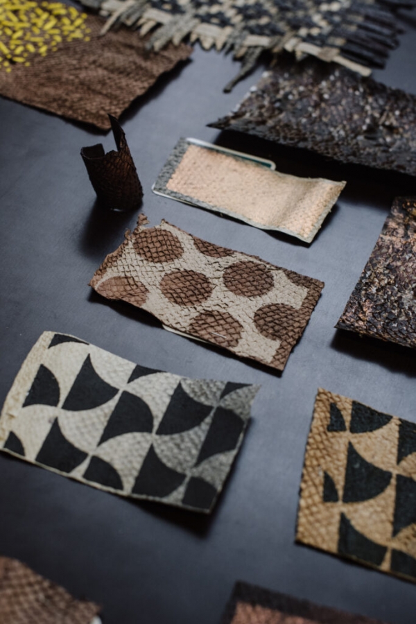 Cette collaboration s’est développée autour du cuir de poisson, un matériau singulier et écoresponsable, issu des déchets de l’industrie agroalimentaire et transformé selon des procédés de tannage naturels. Ensemble, différentes pistes ont été explorées afin d’en révéler les qualités esthétiques et fonctionnelles.
