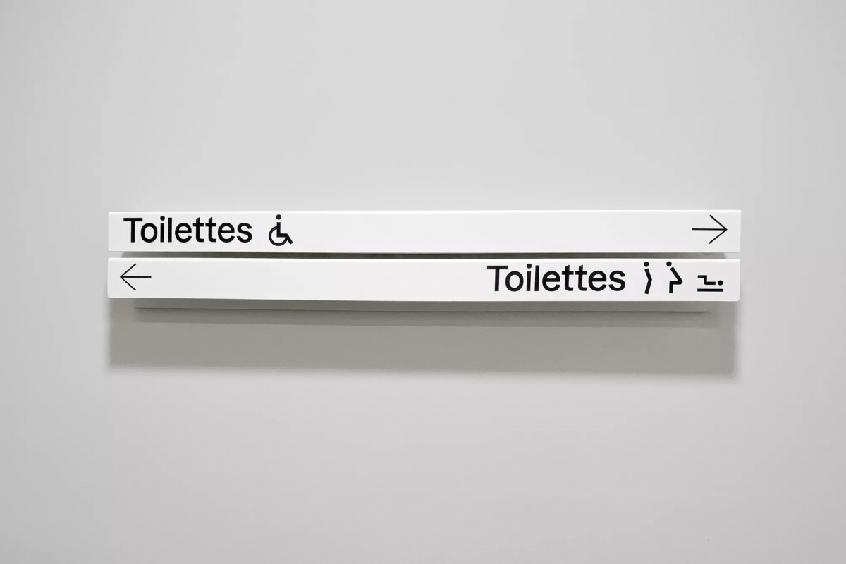 La signalétique a été conçue pour être claire et lisible par tous les publics, s'adaptant aux différents espaces : grand public, loges et zones techniques.