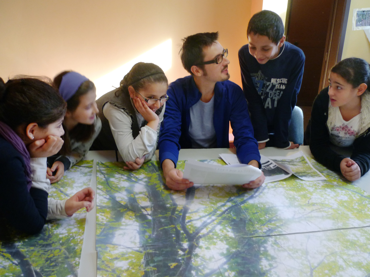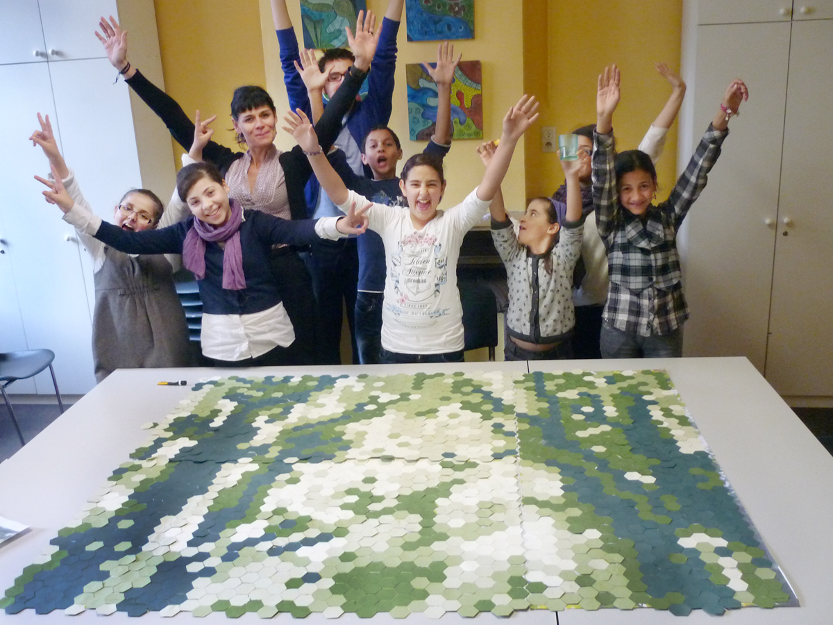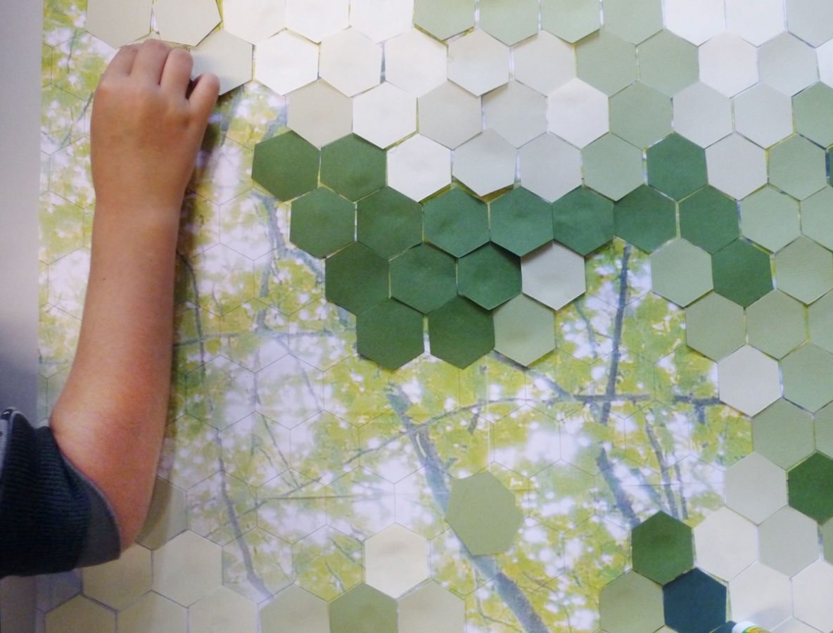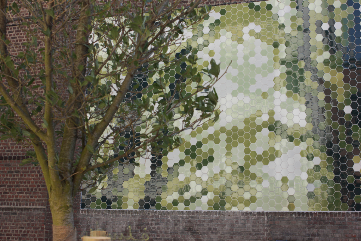 Cette rue offrant une belle perspective sur les arbres et le lierre tombant des murs, le concept s'est basé sur l’interprétation de la nature à partir de pixels. Lors d’ateliers, les enfants de l’école du voisinage ont appris la pixellisation. En combinant des carreaux de 5 tons de vert, ils ont pu recomposer au plus proche l’image de départ.